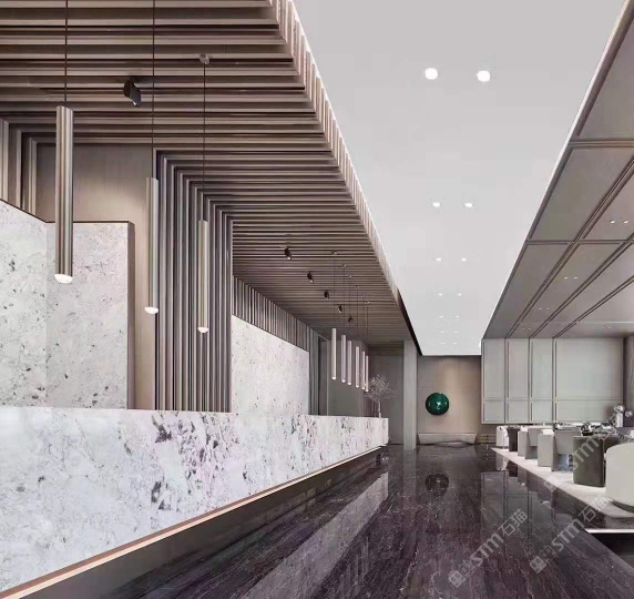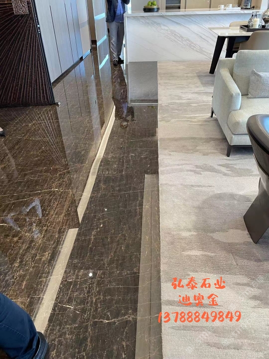 2015年,弘一集團(tuán)董事長(zhǎng)王星華在廈門展展會(huì)上與迪奧金礦主不期而遇。王星華對(duì)迪奧金表示出了極大的興趣,隨后應(yīng)邀到達(dá)礦山實(shí)地考察,在全面了解了礦山的運(yùn)營(yíng)狀況、產(chǎn)品狀況以及特性之后,王星華果斷地拿下了迪奧金及墨流金礦山的代理權(quán),并為此成立了一個(gè)單獨(dú)的石材貿(mào)易部——弘泰石業(yè),該部門由黃青海著手經(jīng)營(yíng)。 In 2015, Wang Xinghua, the chairman of Hongyi Group, met the owner of DiorGold Mine unexpectedly at the Xiamen Exhibition. Wang Xinghua expressed hisgreat interest in Dior Gold Mine, and later was invited to make on-the-spotinvestigation of the mine. After a comprehensive understanding to the operationstatus, product status and characteristics of the mine, Wang Xinghua decisivelysigned an agreement with Dior Gold Mine to get its exclusive agency, andestablished a separate stone trade department for this purpose -- Hongtai StoneIndustry, which is operated by Huang Qinghai. 弘泰石業(yè)經(jīng)營(yíng)地址位于水頭鎮(zhèn)福山工業(yè)區(qū)弘一大板市場(chǎng)一期5號(hào)通道D7-D14。弘泰石業(yè)主營(yíng)品種為迪奧金、墨流金、延河黑。其中迪奧金和墨流金年開采量達(dá)15000m3,水頭長(zhǎng)期庫(kù)存現(xiàn)貨各20000㎡,荒料5000噸。能夠即時(shí)滿足采購(gòu)商的大量采購(gòu)需求。 Located in D7-D14, No.5 Passageway, Hongyi Slab Market Phase I, FushanIndustrial Zone, Shuitou Town, Hongtai Stone is mainly engaged in such productseries as Dior Golden, Ink Flow Golden, Yanhe Black. Among them, the annualmining yield of Dior Golden and Ink Flow Golden is up to 15,000m3, and thestock spotting of each of these two series in Shuitou warehouse is at 20000㎡, with a quantity of quarry stone at 5000 tons, which can instantly meetbulk purchasing needs of the purchasers. ?▲弘泰石業(yè)賣場(chǎng) ▲ Sales Market of Hongtai Stone 迪奧金底色偏深,表面賦以金黃色及少量白色的線狀紋路,板面表現(xiàn)力非常搶眼,材質(zhì)能適用于各種不同的異型加工方式,是的優(yōu)質(zhì)工裝材料,不同于以往的黑色系大理石帶來的沉重感,迪奧金帶來的更多的是時(shí)尚感與尊貴感。 As a rare high-quality material for industrial decoration, Dior golden hasa dark background color, with a small amount of golden yellow and white lineson its surface. The surface expressiveness is very eye-catching, and itsmaterial can be applied to various special-shaped processing methods. Unlikethe feeling of heaviness of black marble in the past, Dior Golden brings morefashion and dignity. 與此同時(shí),墨流金與延河黑帶來的表現(xiàn)力同樣不俗,整體表面風(fēng)格質(zhì)樸大方,莊重肅穆,經(jīng)過設(shè)計(jì)師的巧妙搭配亦能成為整體空間之中的點(diǎn)睛之筆。 And, the expressiveness brought by Ink flow golden and Yanhe black is alsonot hackneyed. The overall surface style is simple and elegant, solemn andsober, and it can become the highlight of the whole space through ingeniouscollocation by designers.
