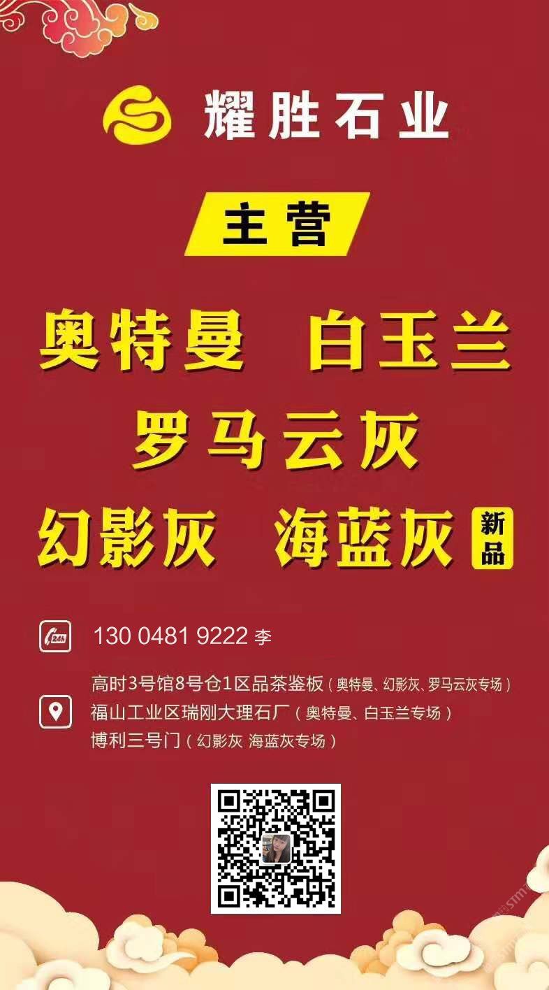 耀勝石材 聯(lián)系人:李女士    130****9222 查看 130****9222 查看 主營范圍: 大板批發(fā)、荒料、大理石加工、礦山、 企業(yè)地址:福建泉州南安市水頭鎮(zhèn)