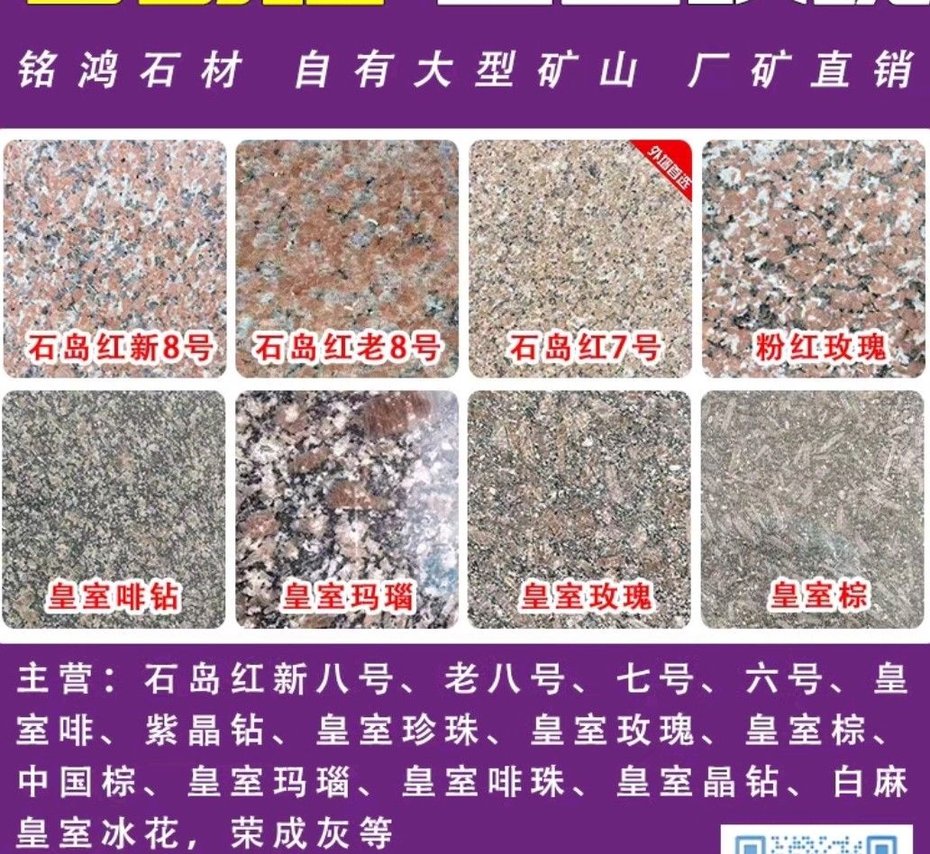 發(fā)布信息: 榮成市人和鎮(zhèn)銘鴻石材 主營(yíng) 石島紅新八號(hào)、老八號(hào)、七號(hào)、六號(hào) 皇室啡、紫晶鉆、皇室珍珠、 皇室玫瑰、皇室棕、中國(guó)棕、 皇室瑪瑙、皇室啡珠、皇室晶鉆、白麻,皇室冰花,榮成灰,等 歡迎新老客戶來(lái)考察與下 訂單 電話:15063142888 地址:山東省榮成市人和鎮(zhèn)