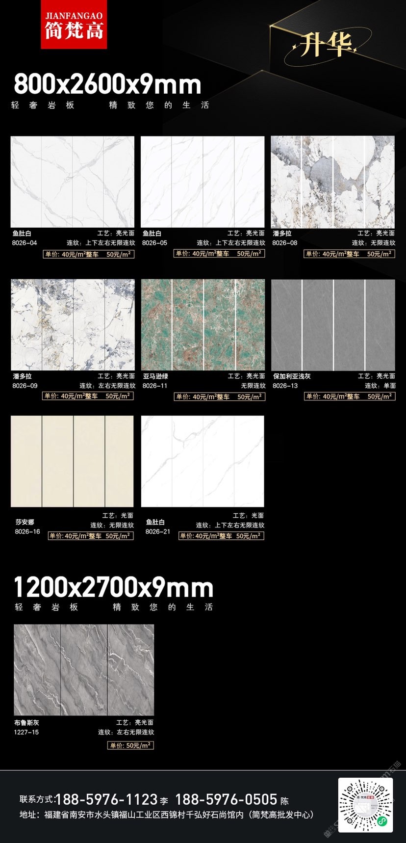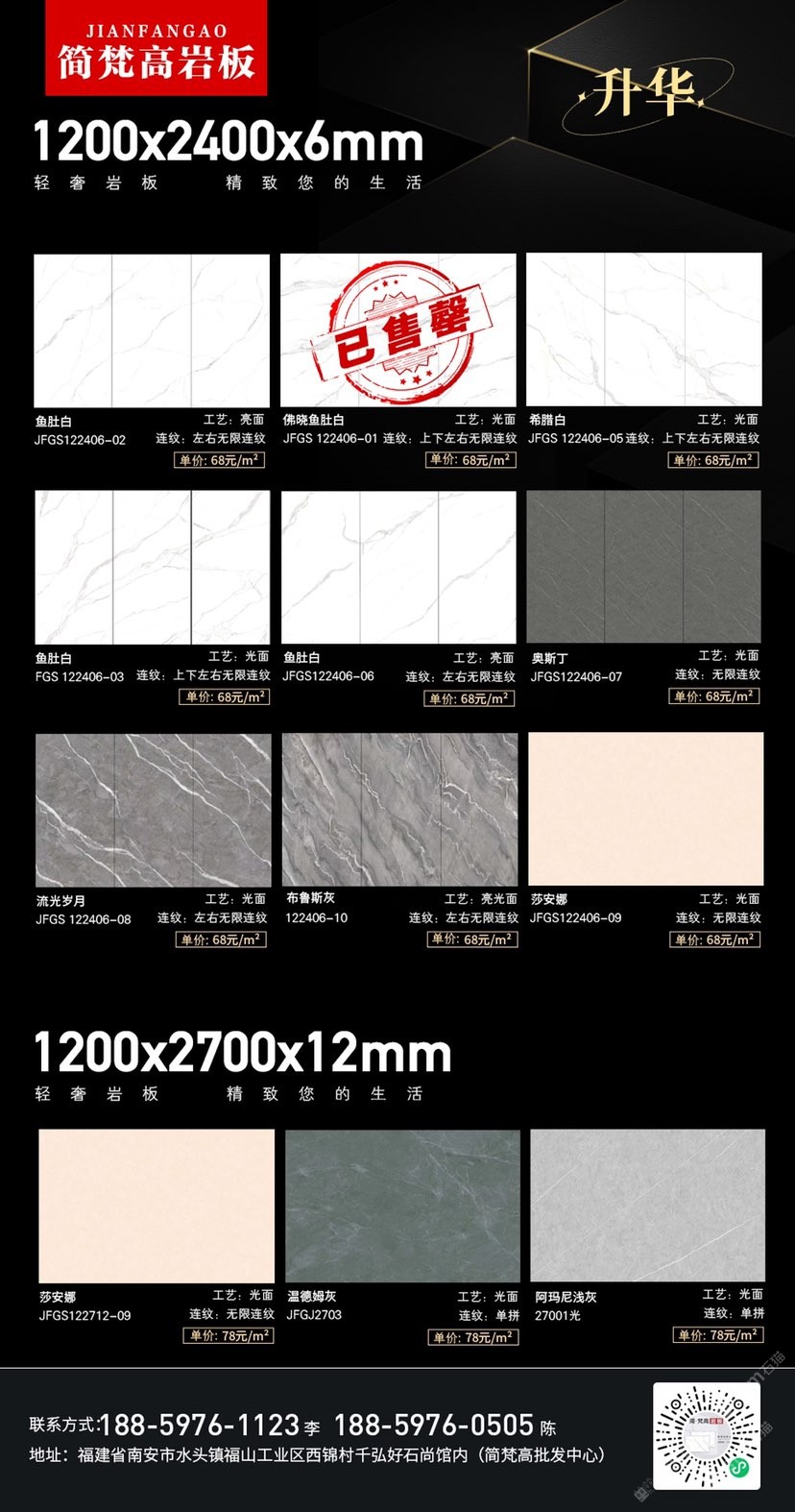 簡梵高巖板(批發(fā)) 聯(lián)系人:陳先生    188****0505 查看 手機(jī)號碼:無 主營范圍: 大板批發(fā)、環(huán)境石材、人造石加工、 企業(yè)地址:福建南安水頭鎮(zhèn)福山工業(yè)西錦村千弘好石尚館內(nèi)(批發(fā)中心)