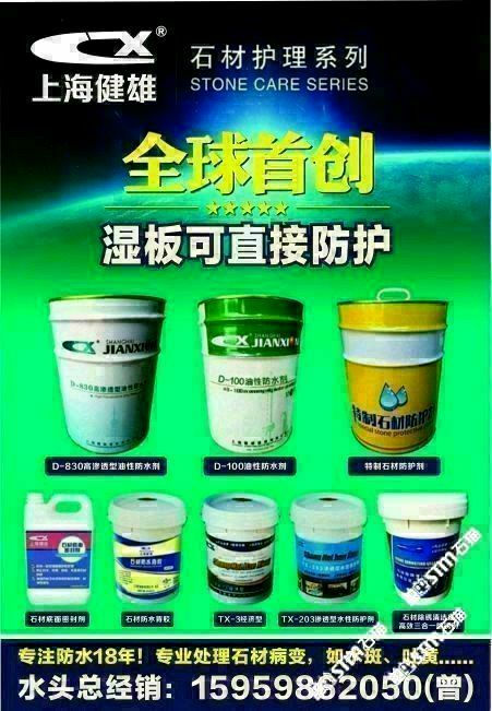發(fā)布信息: 需要做防水的找我哦!主營:水性防水劑,油性防護(hù)劑(濕板直接防水,質(zhì)量超級好!),花崗巖除銹劑(超級好用,不會(huì)再反銹),大理石除黃劑,花崗巖增色增艷劑!水斑劑等等!咨詢電話??15959862050