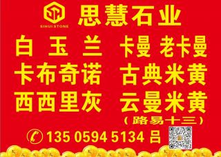 思慧石業(yè)主營(yíng)產(chǎn)品:白玉蘭,白玉蘭3,白玉蘭(8號(hào)礦),白玉蘭(艾斯特),白玉蘭(白珍珠),白玉蘭ECE,白玉蘭(EG礦),白玉蘭(飛馬礦),白玉蘭2,白玉蘭1,白玉蘭4,西西里灰,西西里灰1,西西里灰2,古典米黃,古典米黃1,卡布奇諾,云曼米黃,云曼,卡曼,卡曼米黃,金卡曼,路易十三,路易十三1(CGM),勞力士灰,奧特曼,歐曼米黃,奧特曼(巴拉礦),奧特曼(捷成礦),奧特曼(卡麻桑礦),奧特曼(老蕭礦),奧特曼(卡瑪薩礦),奧特曼米黃,奧特曼金,白玉蘭(胖子礦),白玫瑰企業(yè)地址:福建泉州東升石材城4號(hào)門(mén)通道走到底左手邊D26